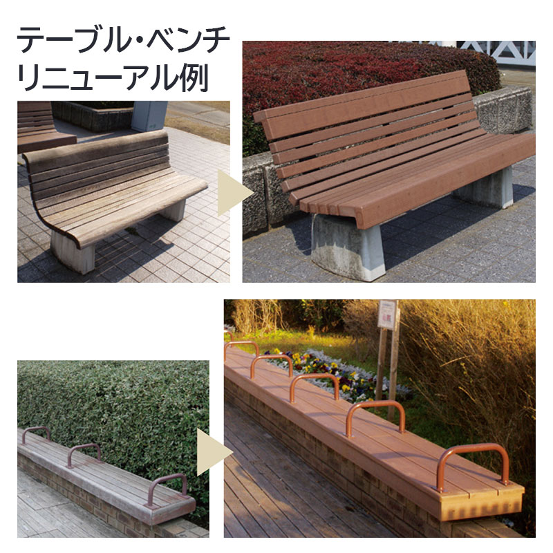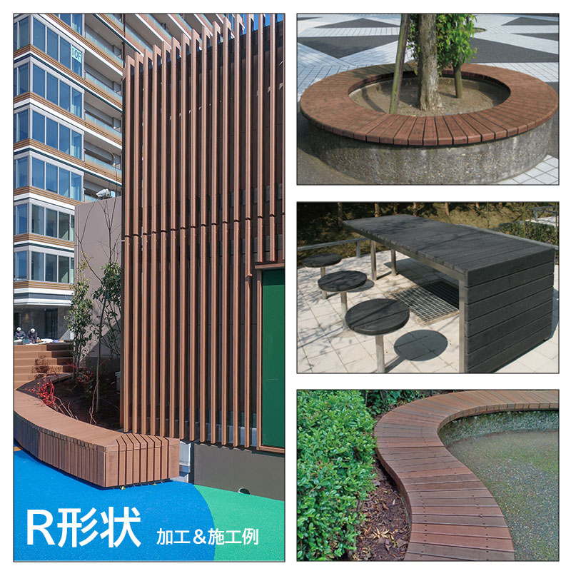 屋外の過酷かつ多様な使用環境で安定した性能を発揮するムク材は、中空部がなく加工が容易なためR形状など多くの用途に柔軟に対応でき、既存フレームを生かしたテーブル・ベンチ等のリニューアルにも最適です。
