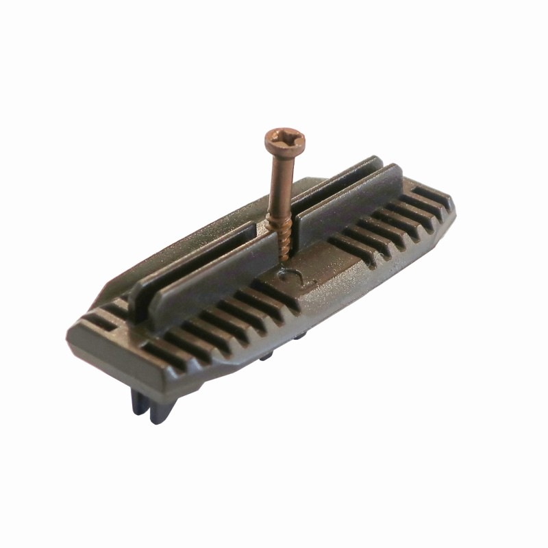 デッキ材の溝を利用して根太材を固定するワイドQCSは、デッキ表面にビスが露出しない美しい仕上がりを実現。下穴加工や幅方向の目地調整が不要なため、施工時間の短縮と品質の向上を図れます。さらにデッキ面を傷つけずに固定。取り外しも容易なため、大きな損傷がなければデッキ材を裏返して再利用することもできます。※ワイドQCSはハンディウッドオンラインショップ掲載デッキ材でのご使用に限ります。