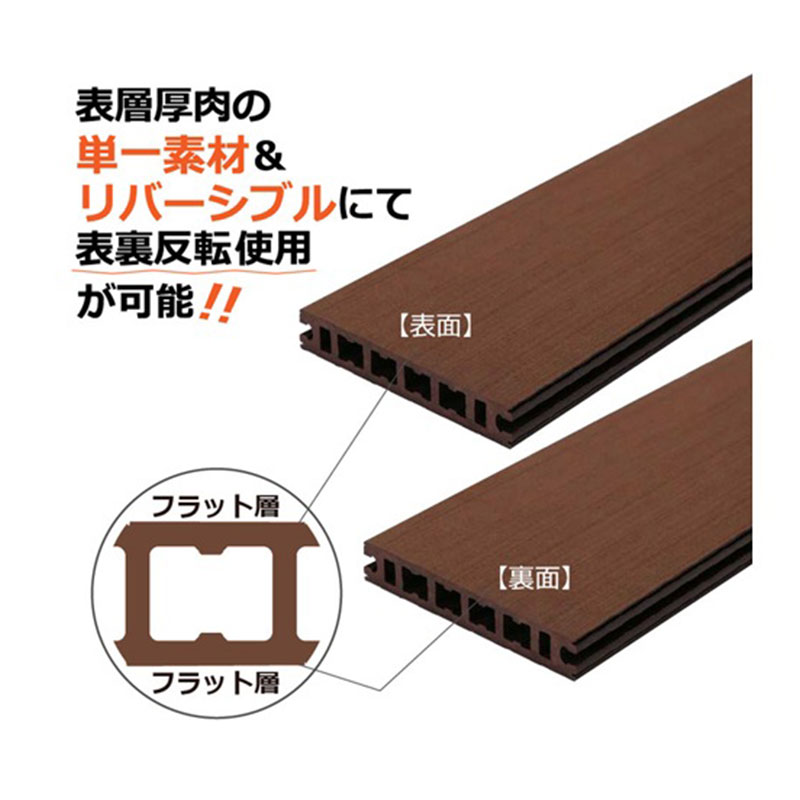 天然木材(南洋材・ハードウッド)の代替品として誕生したフラットデッキ材。特にスタンダードサイズの25-145開は副資材等も充実しており、公共施設・教育施設・大型商業施設~住宅まで様々な現場のニーズに対応します。商品説明