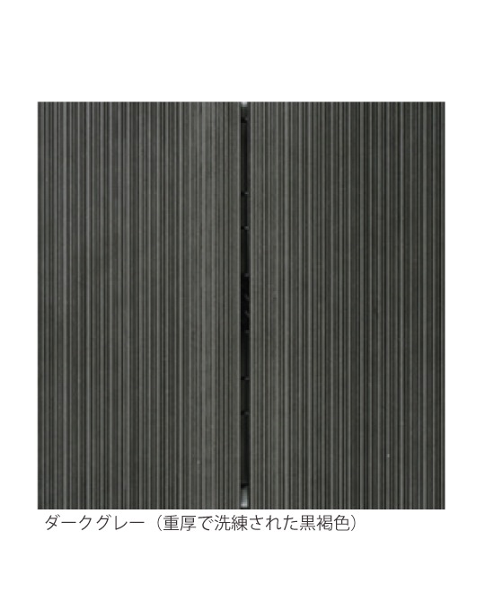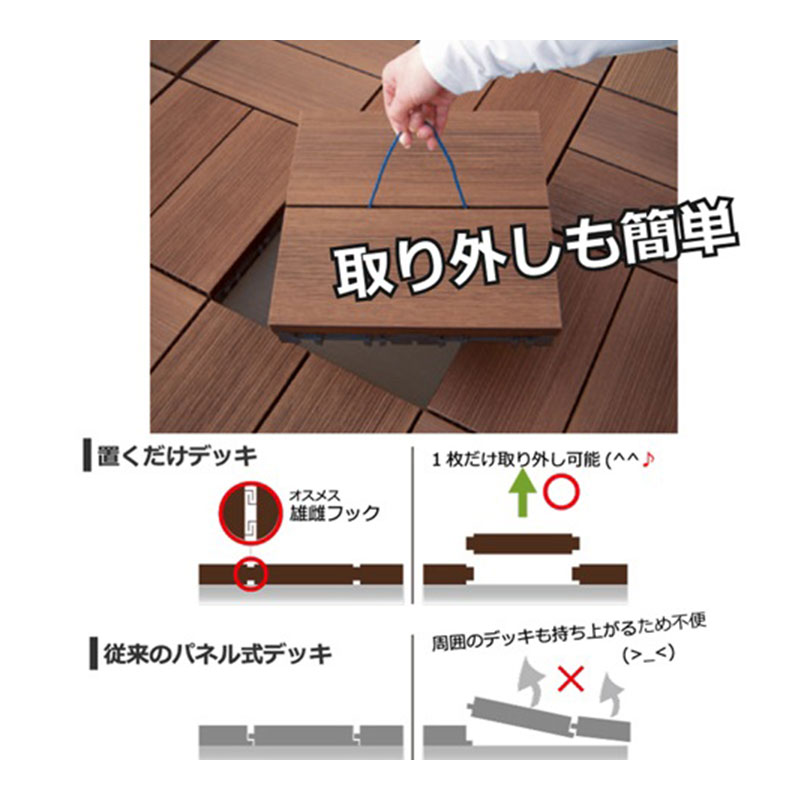 置くだけデッキは光の乱反射効果を生み出す表層デザインにより、設置方向を変えるだけで印象を変えることができるパネル式デッキ材です。特別な道具や専門知識を必要としないため、女性一人でも短時間で設置。取り外しも可能です。また状況に応じてカットや穴開けなどの加工が可能なため、ベランダの排水溝まわりなどもスッキリと納めることができ、簡単なのに本格的な仕上がりを楽しめます。置くだけデッキ Eタイプ ストレートデザイン スタンダード